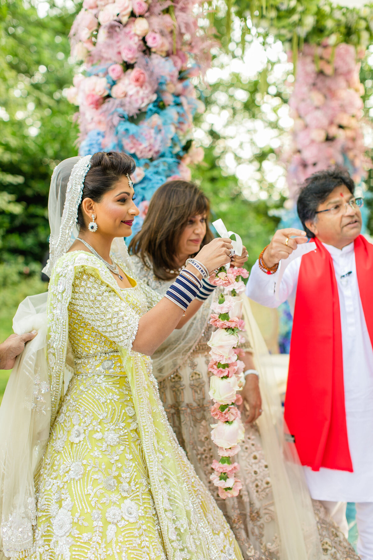 The couple exchanged vows beneath a unique mandap in the pavilion, surrounded by nature. Rhea made a stunning entrance shaded by a floral parasol held by her brother, symbolizing family and love. She wore a custom yellow Manish Malhotra lehenga, a non-traditional bridal color representing sunshine and happiness, paired with matching Jimmy Choo sandals.