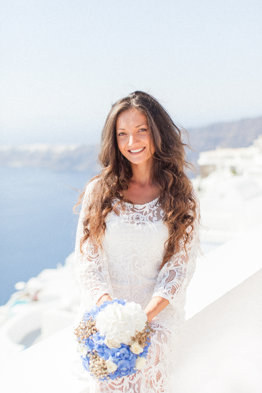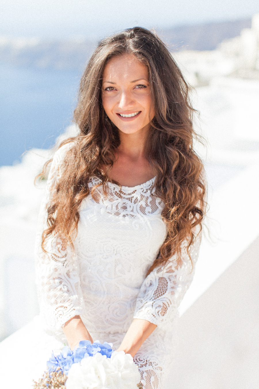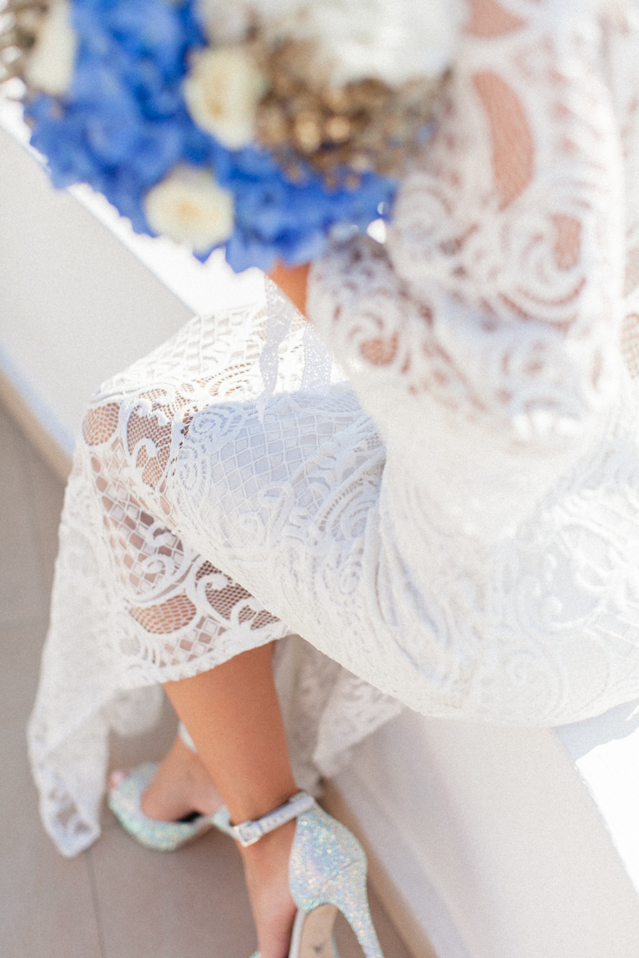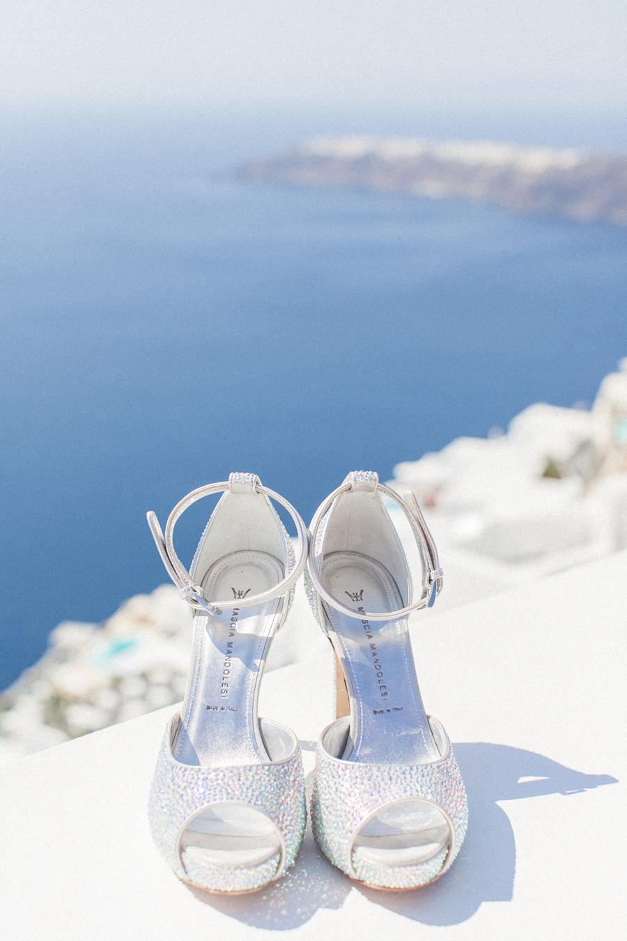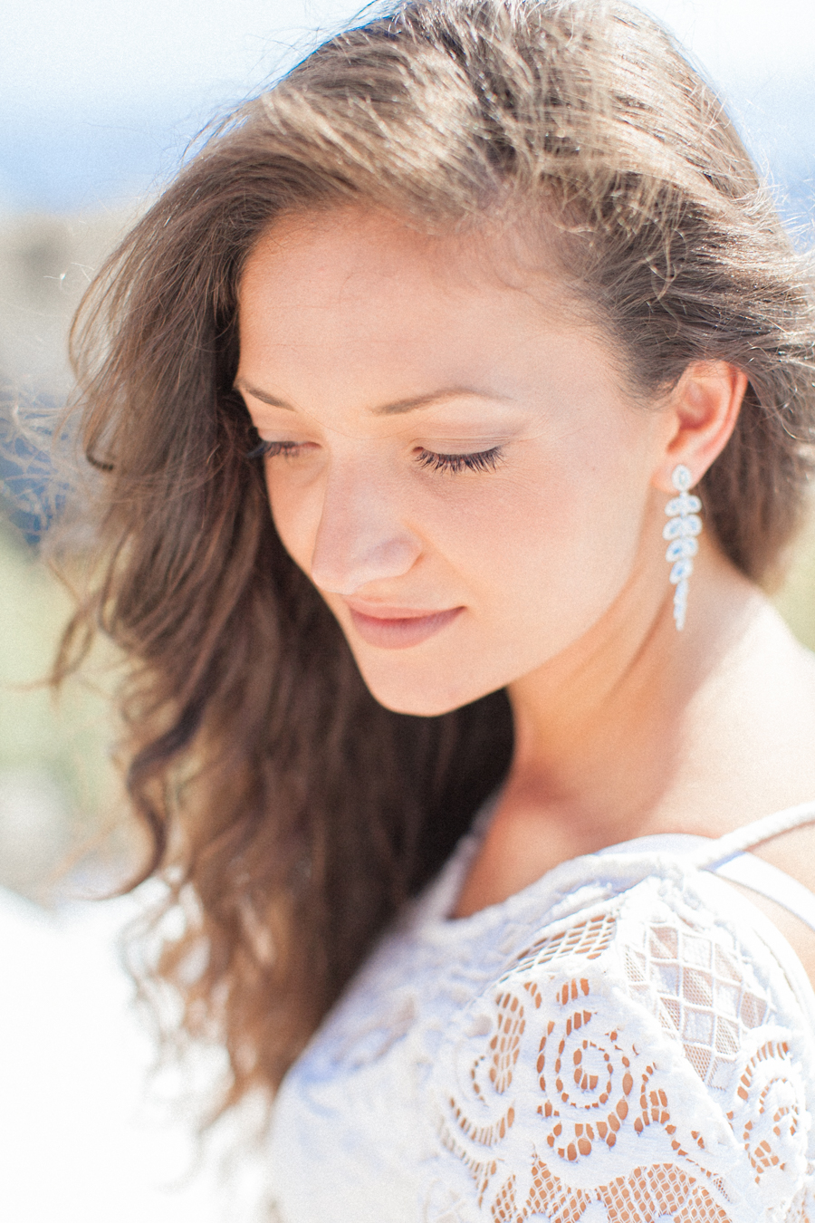 Photography – Roberta Facchini | Design, Planning & Flowers  – Santoweddings by MK | Venue – La Maltese, Santorini, Greece | Stationery – Augusta Cole | Bride’s Dress – BSB by Blue Santorini | Bride’s Shoes – Mascia Mandolesi | Ring – Tiffany | Earrings – Swarovski | Cake – Petranart