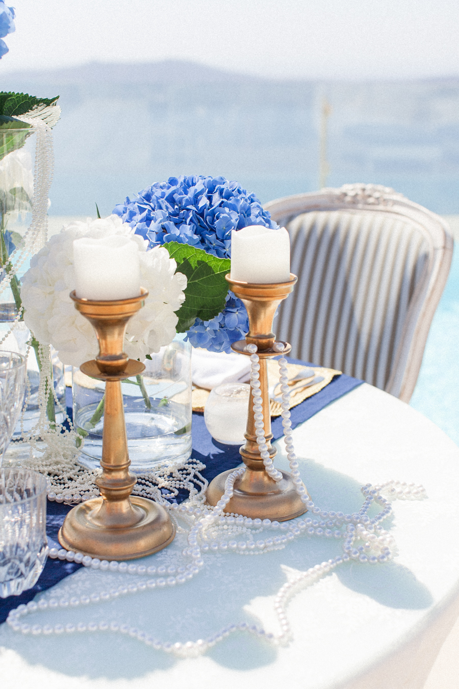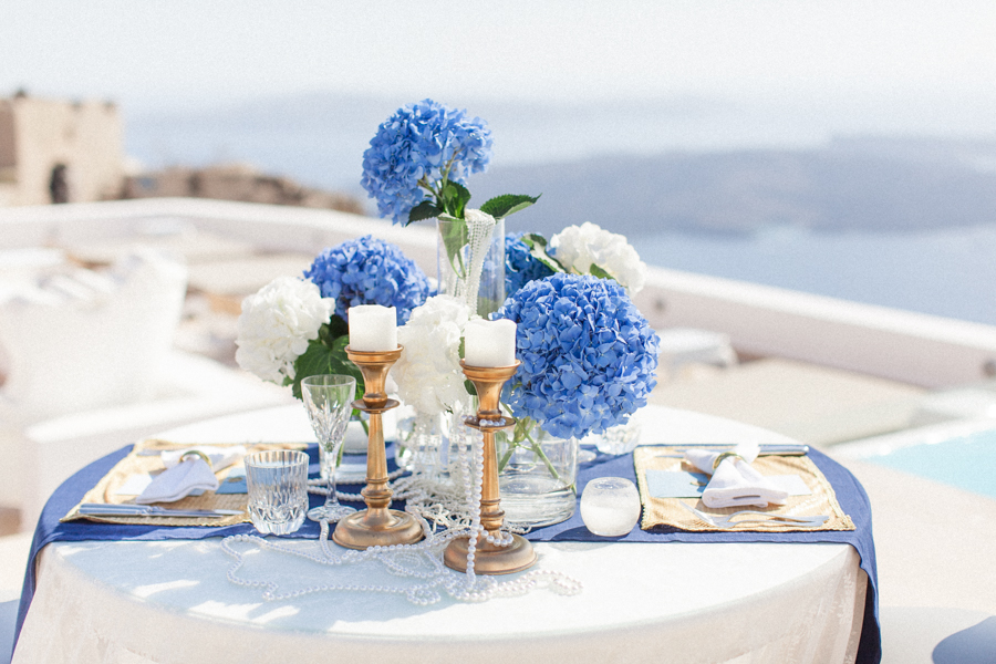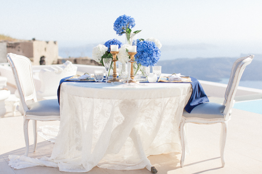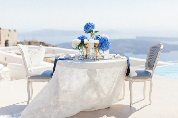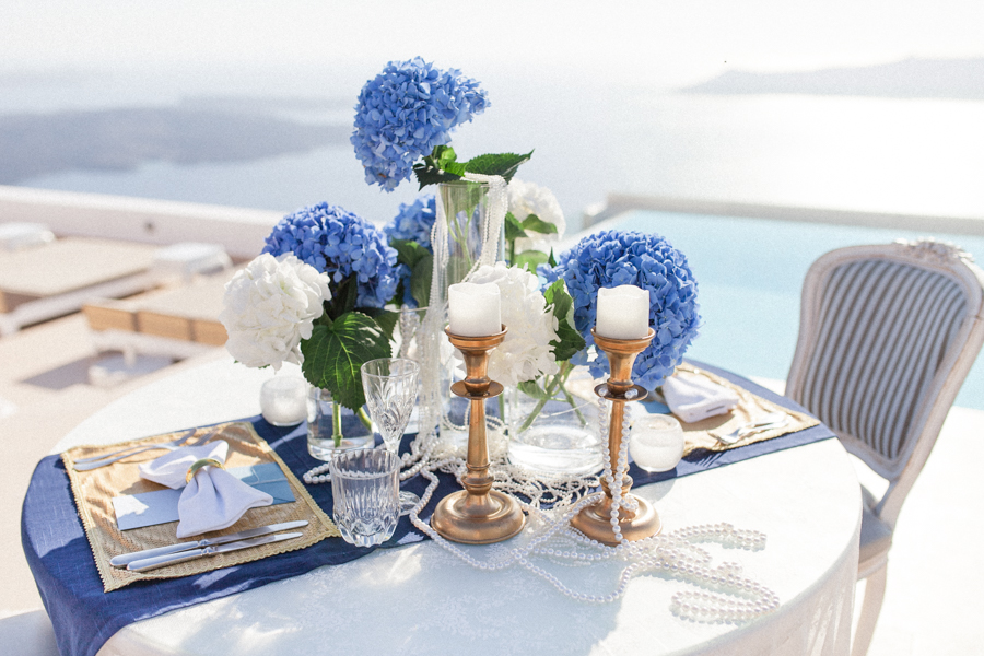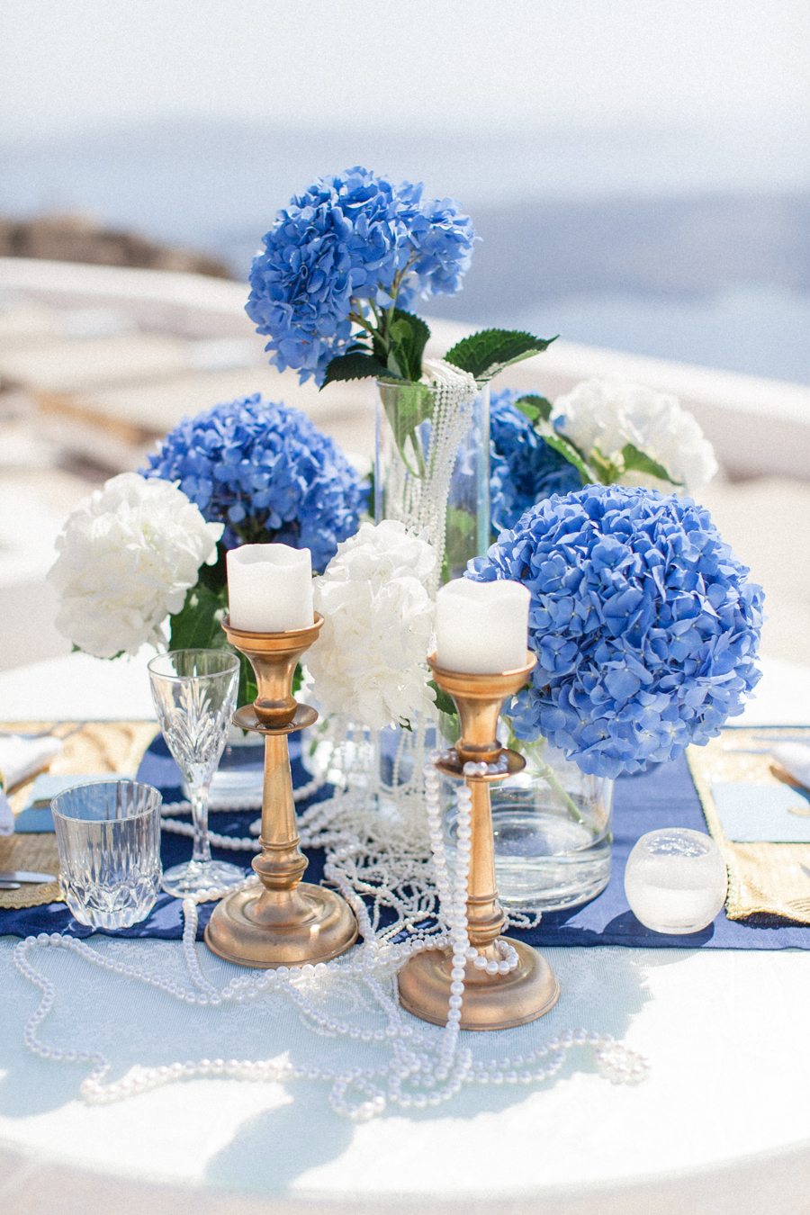 The colour palette for the event was inspired by the iconic Greek colours of blue and white with touches of gold and silver bringing added opulence to the look of the table. I loved the big hydrangeas on the couple’s table that Santoweddings by MK used and the sequined place mats caught the sun perfectly.
