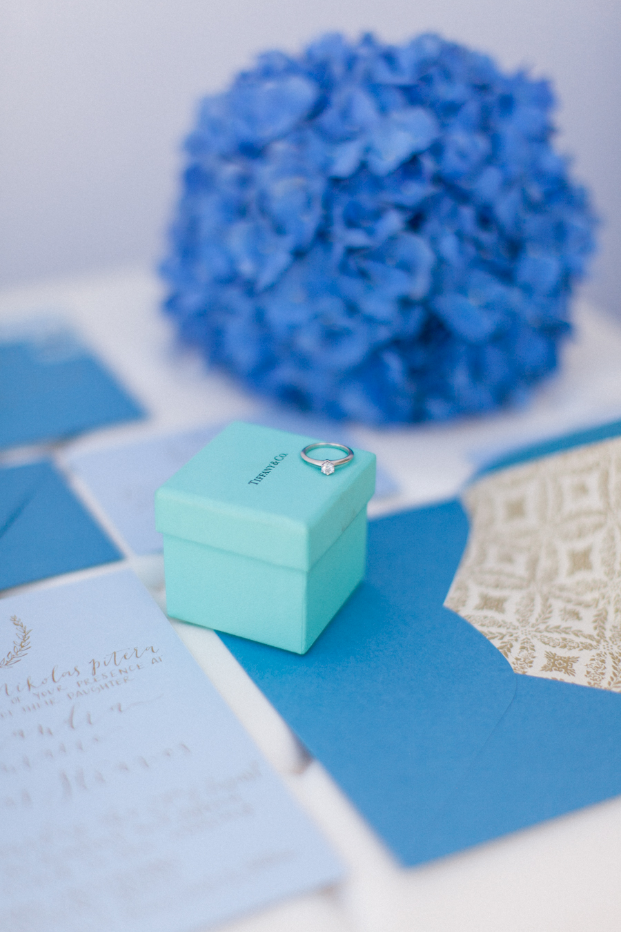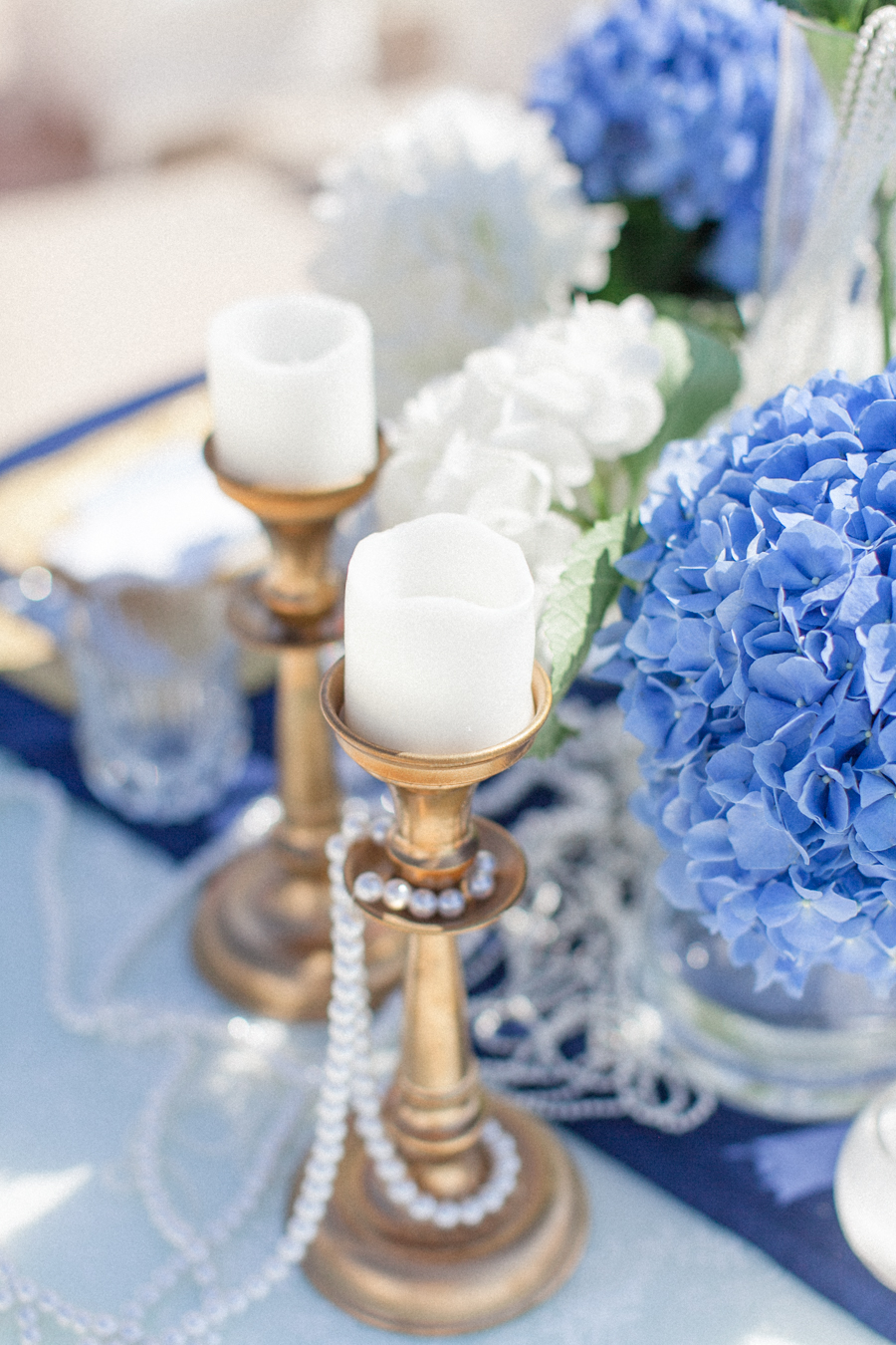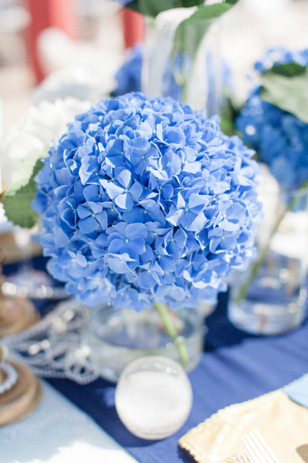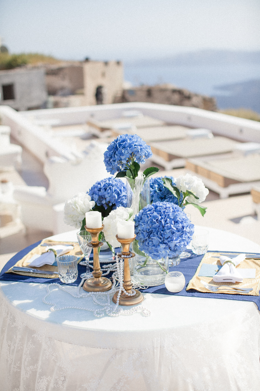 The colour palette for the event was inspired by the iconic Greek colours of blue and white with touches of gold and silver bringing added opulence to the look of the table. I loved the big hydrangeas on the couple’s table that Santoweddings by MK used and the sequined place mats caught the sun perfectly.