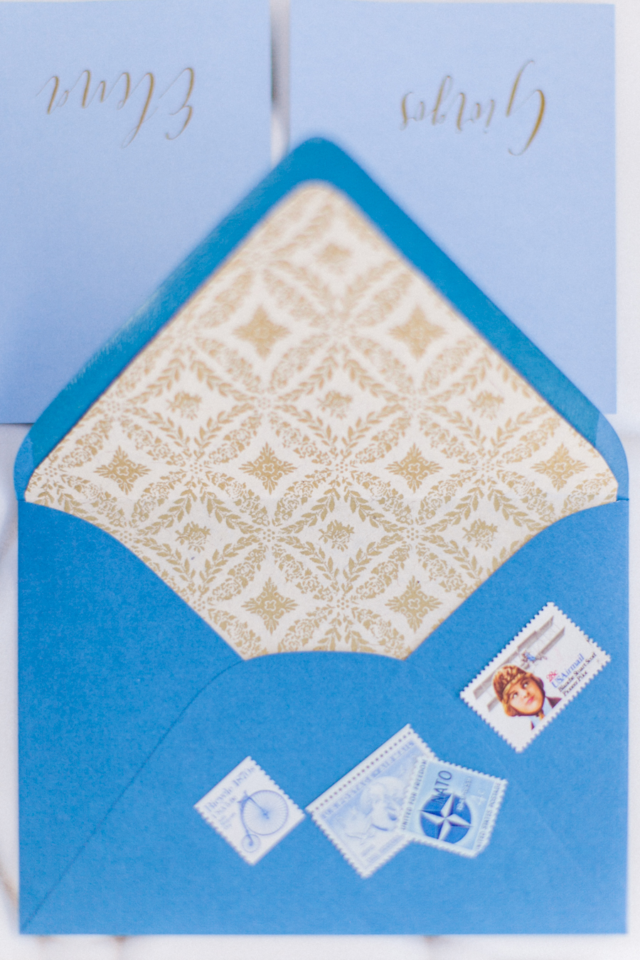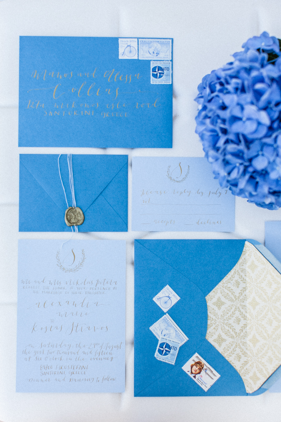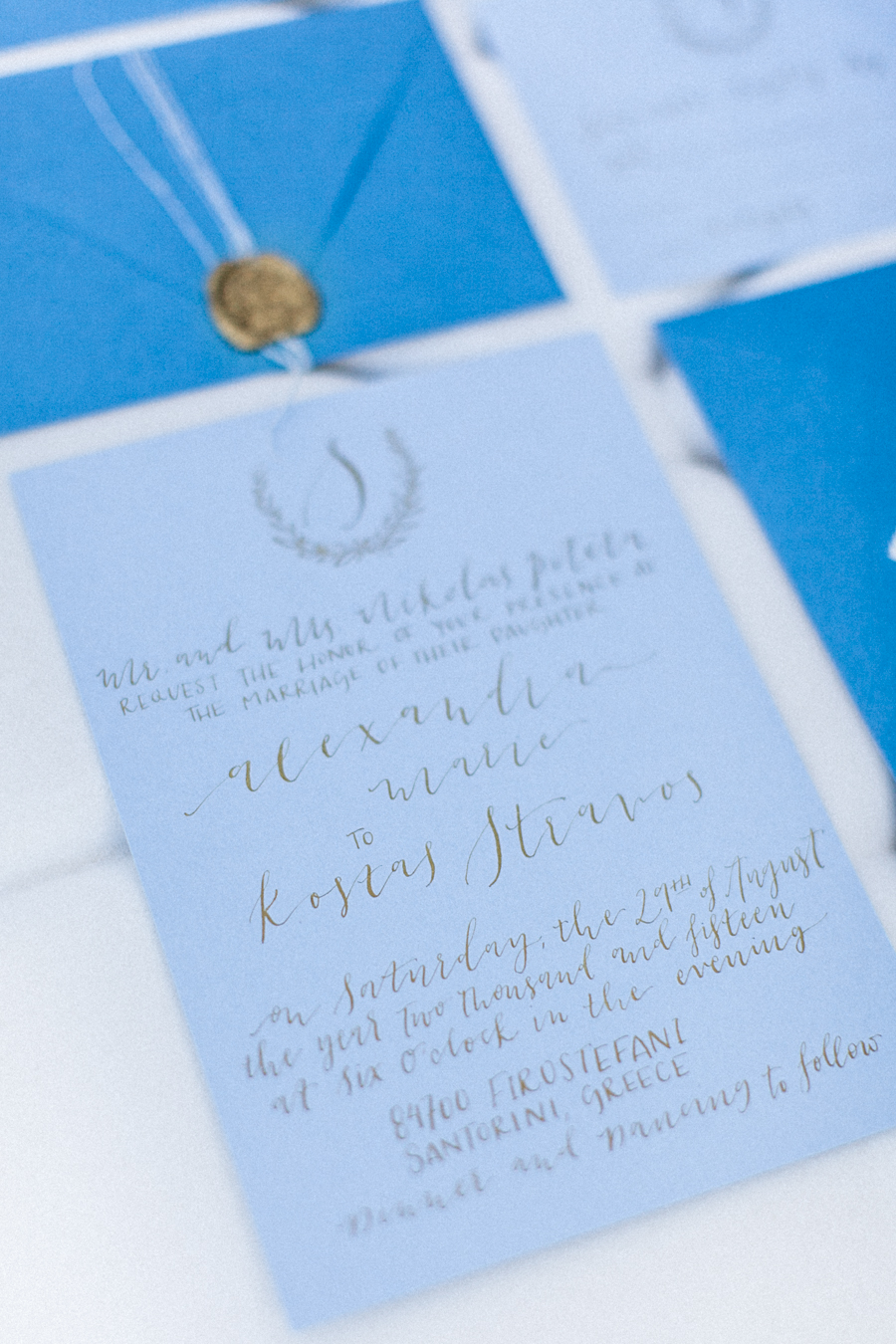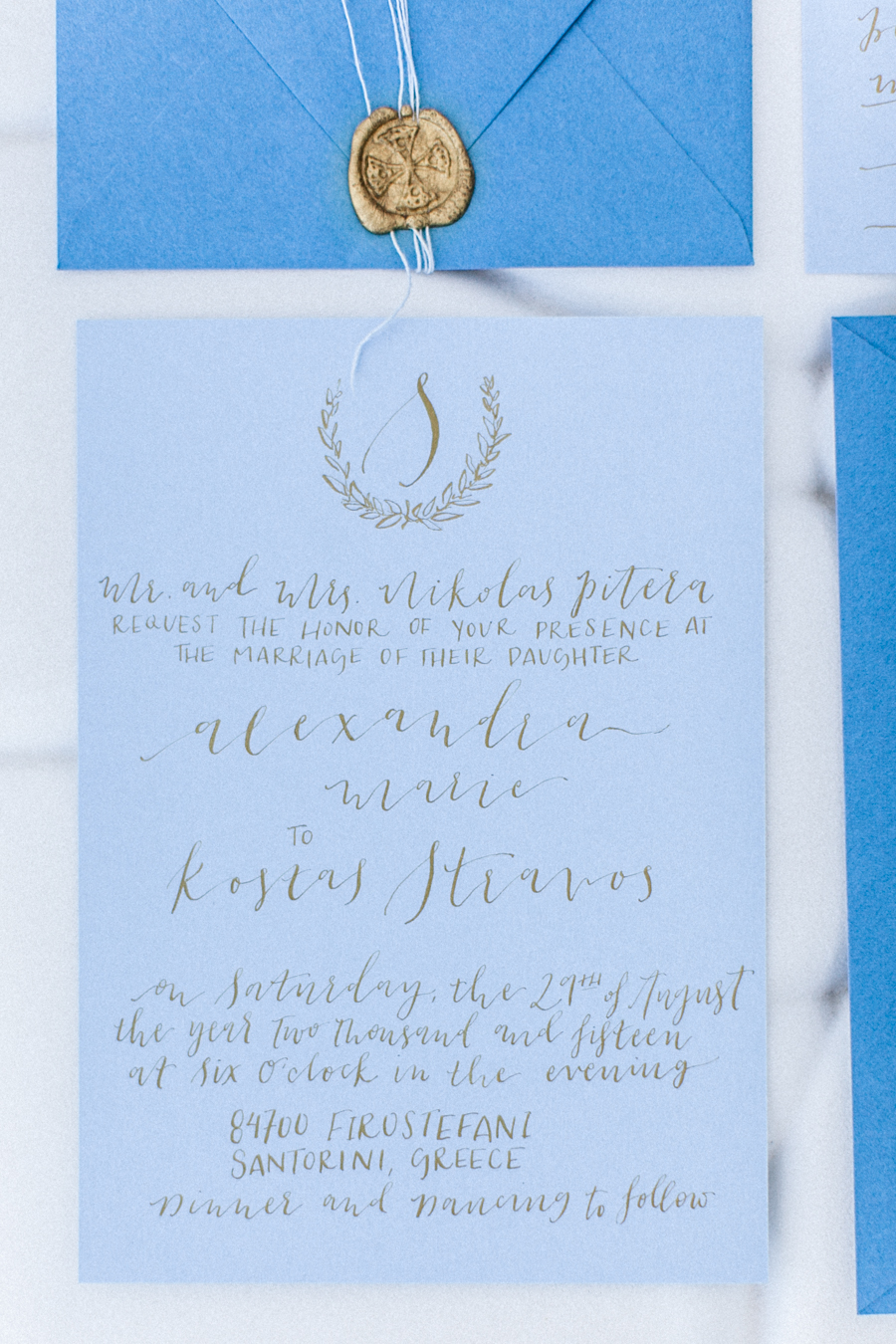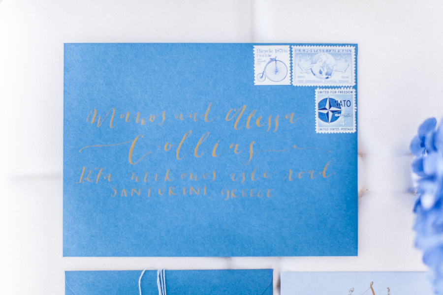 Talented American calligrapher Augusta Cole created a delightful stationery suite that is ideally suited to a wedding on Santorinithe colours, the relaxed calligraphy and the gorgeous golden embellishments are elegant, refined and absolutely fitting for a Greek destination wedding. I have to say that I loved the patterned envelope liner – such a wonderful finishing touch.