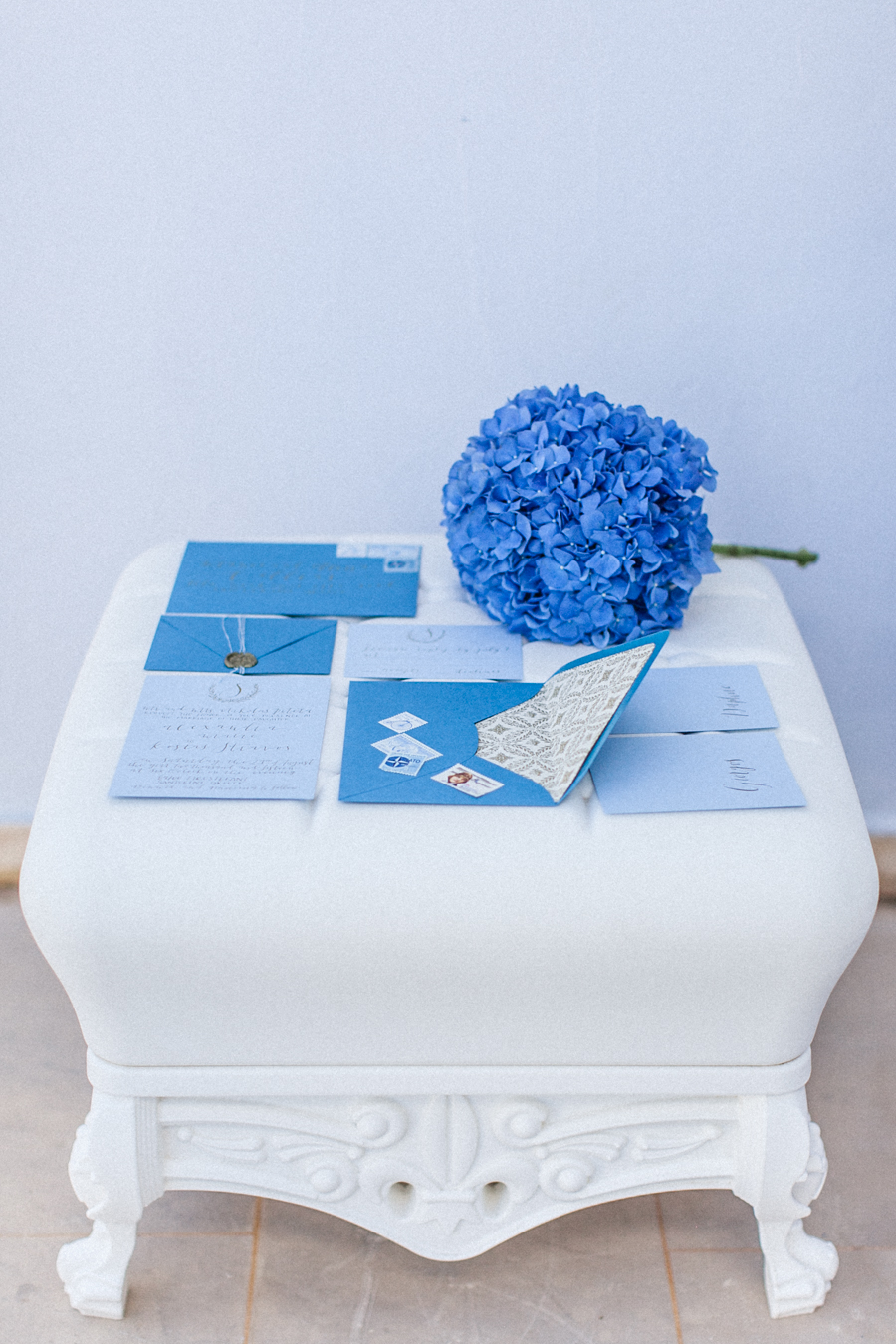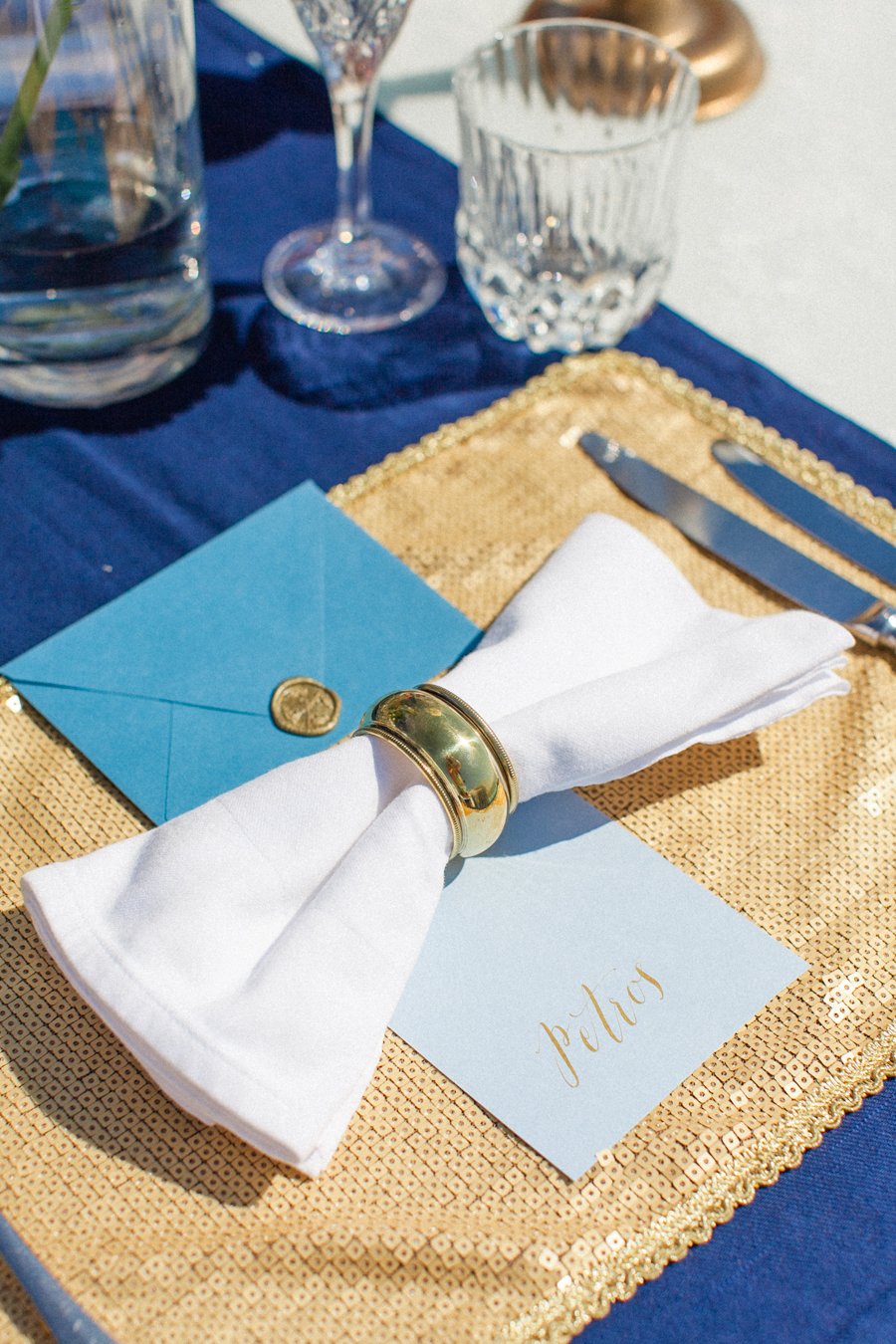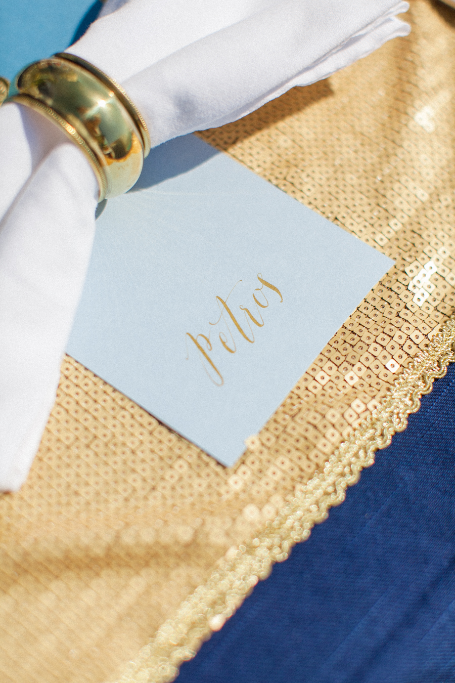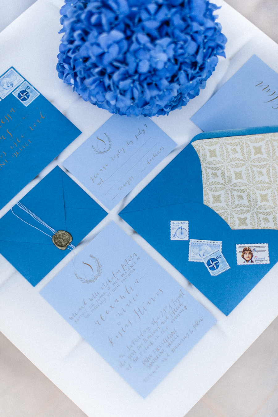 Talented American calligrapher Augusta Cole created a delightful stationery suite that is ideally suited to a wedding on Santorinithe colours, the relaxed calligraphy and the gorgeous golden embellishments are elegant, refined and absolutely fitting for a Greek destination wedding. I have to say that I loved the patterned envelope liner – such a wonderful finishing touch.