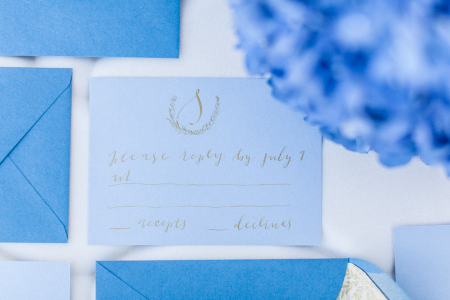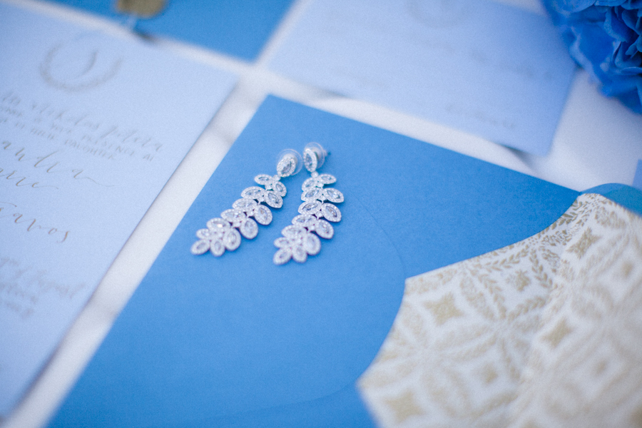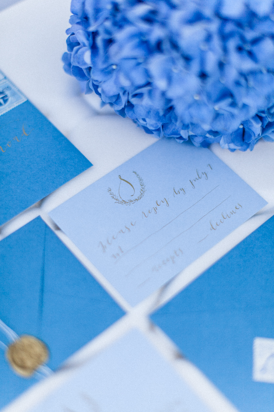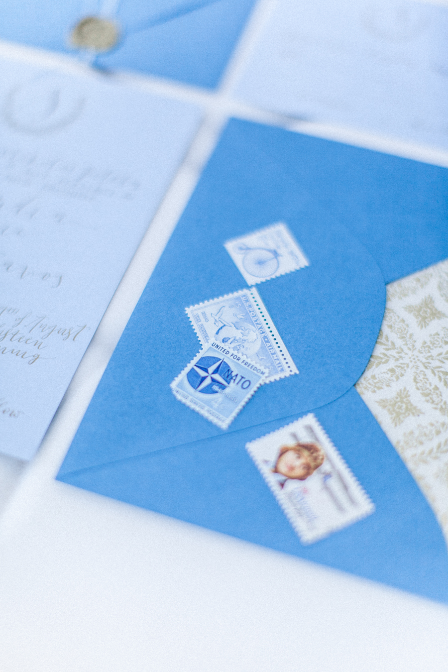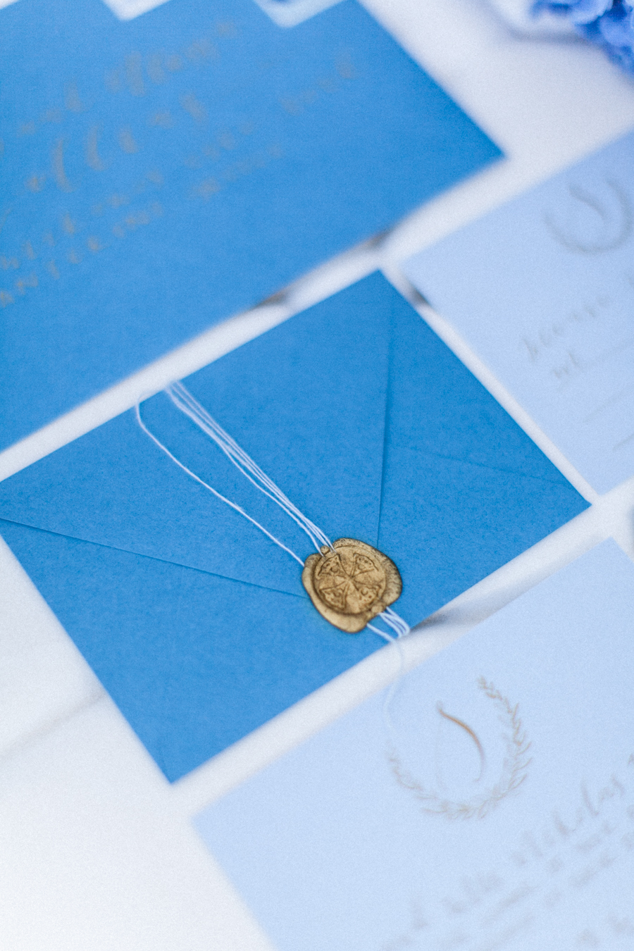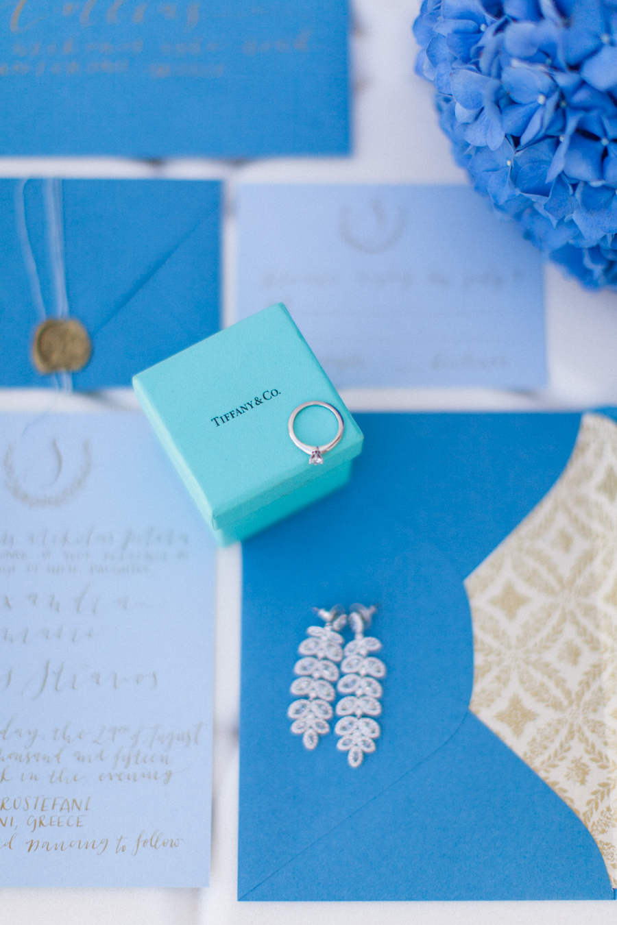 Talented American calligrapher Augusta Cole created a delightful stationery suite that is ideally suited to a wedding on Santorinithe colours, the relaxed calligraphy and the gorgeous golden embellishments are elegant, refined and absolutely fitting for a Greek destination wedding. I have to say that I loved the patterned envelope liner – such a wonderful finishing touch.