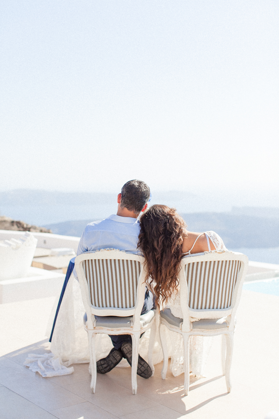 Santoweddings by MK organised their escape and styled an exquisite intimate table for two at the luxury boutique hotel La Maltese, which you’ll find tucked at the far end of the pretty village of Imerovigli. With the table set overlooking the caldera and the dreamy blue Aegean Sea that surrounds Santorini stretching away in the background, Panos and Maria could simply relax before their wedding day and enjoy each other’s company.