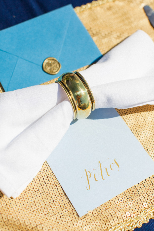 Talented American calligrapher Augusta Cole created a delightful stationery suite that is ideally suited to a wedding on Santorini – the colours, the relaxed calligraphy and the gorgeous golden embellishments are elegant, refined and absolutely fitting for a Greek destination wedding. I have to say that I loved the patterned envelope liner – such a wonderful finishing touch.
