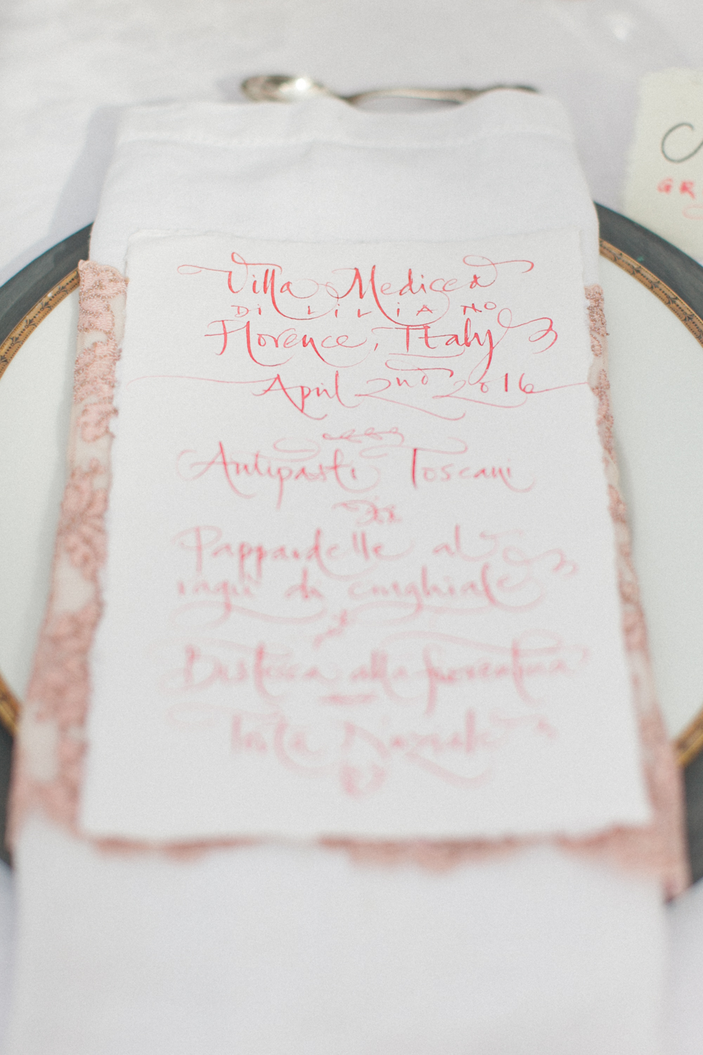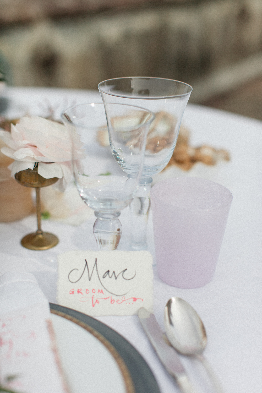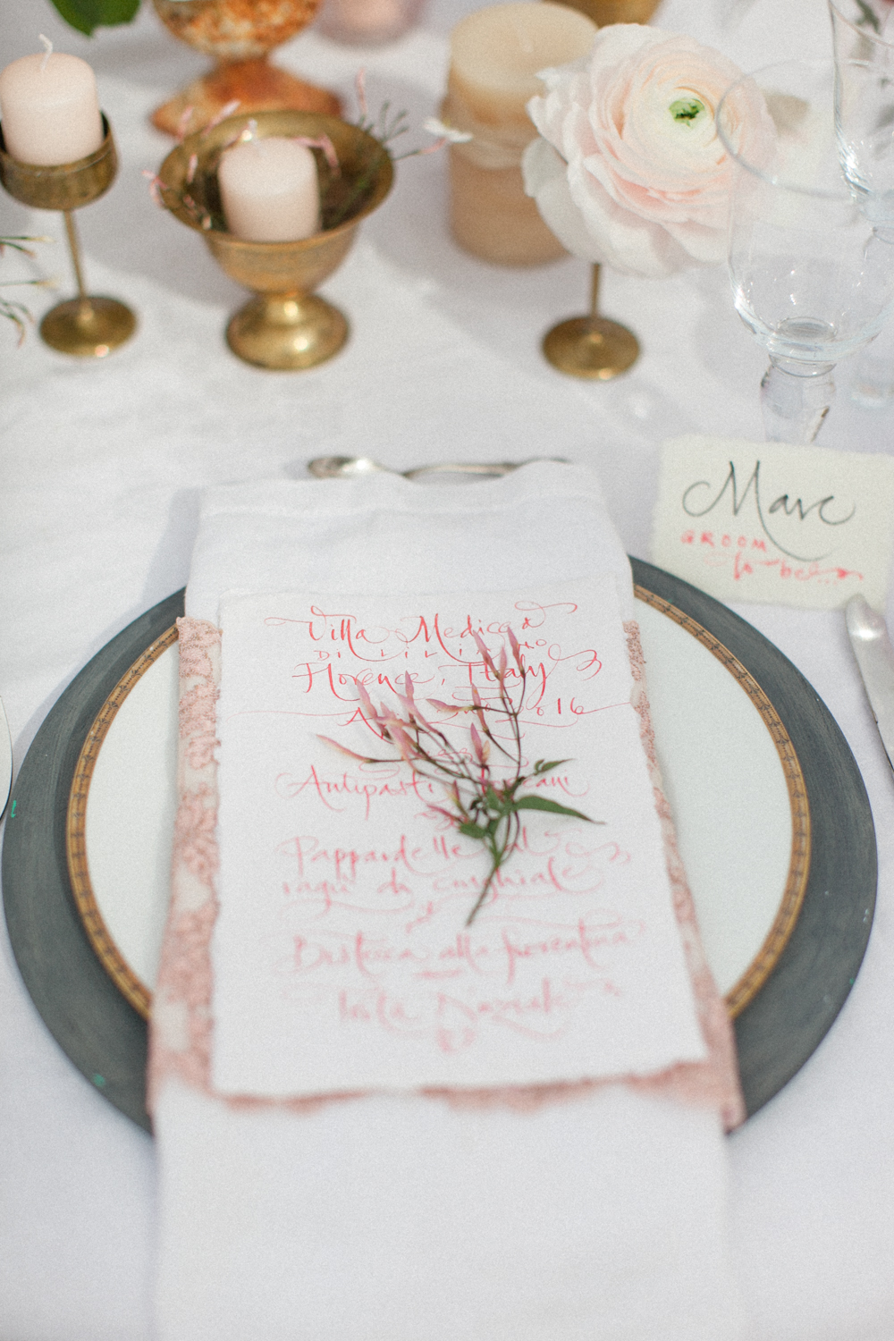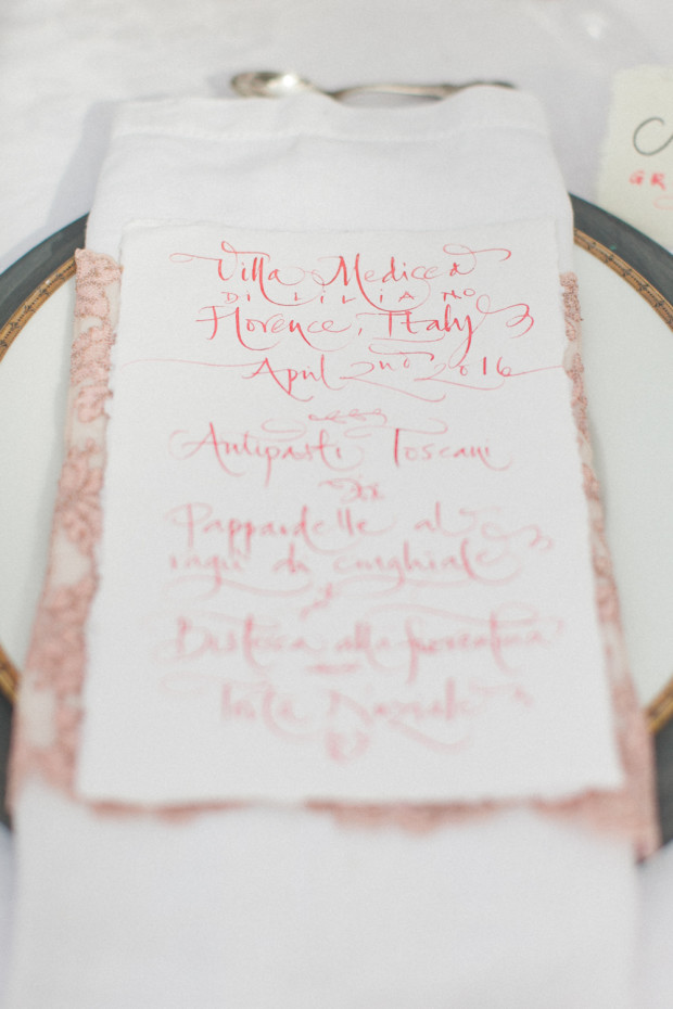 The rose quartz colour palette styled by Natalia Music Weddings looked exquisite against the backdrop of the villa. I adored the dark grey charge plates that sat against the antique white flatware. The crystal glasses, silver cutlery and hand-dyed pastel pink lace created the most elegant and striking settings that really enhanced with occasion and brought a soft beauty to the table as did the breathtaking calligraphy by Betty Soldi – perfect for destination weddings in Italy.