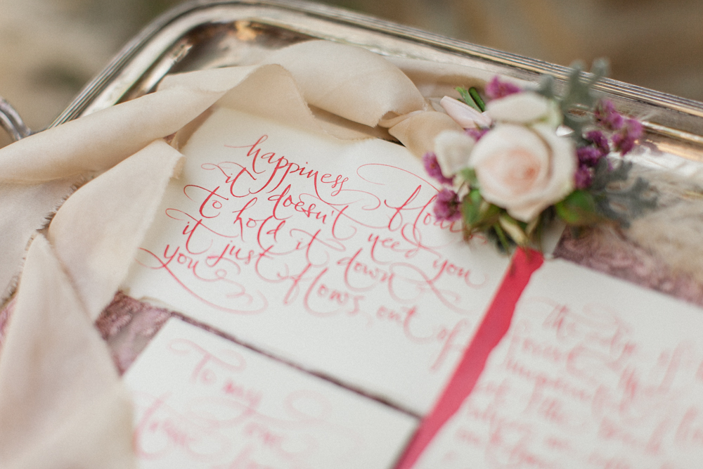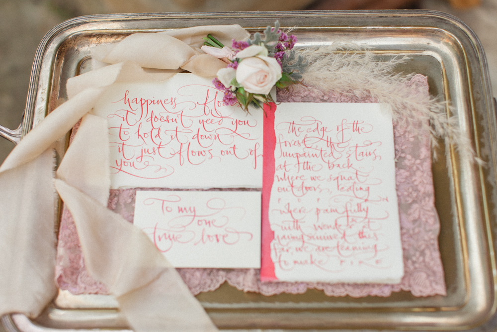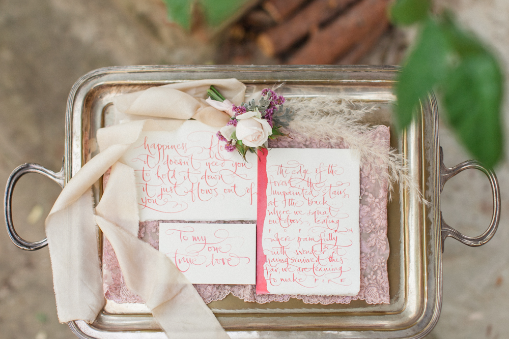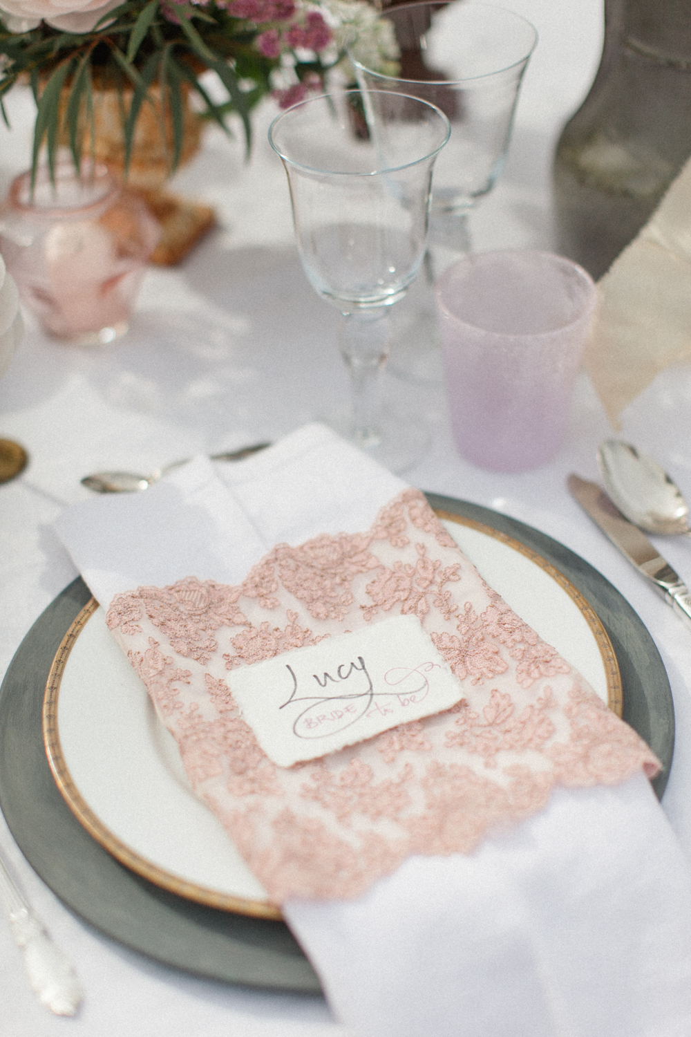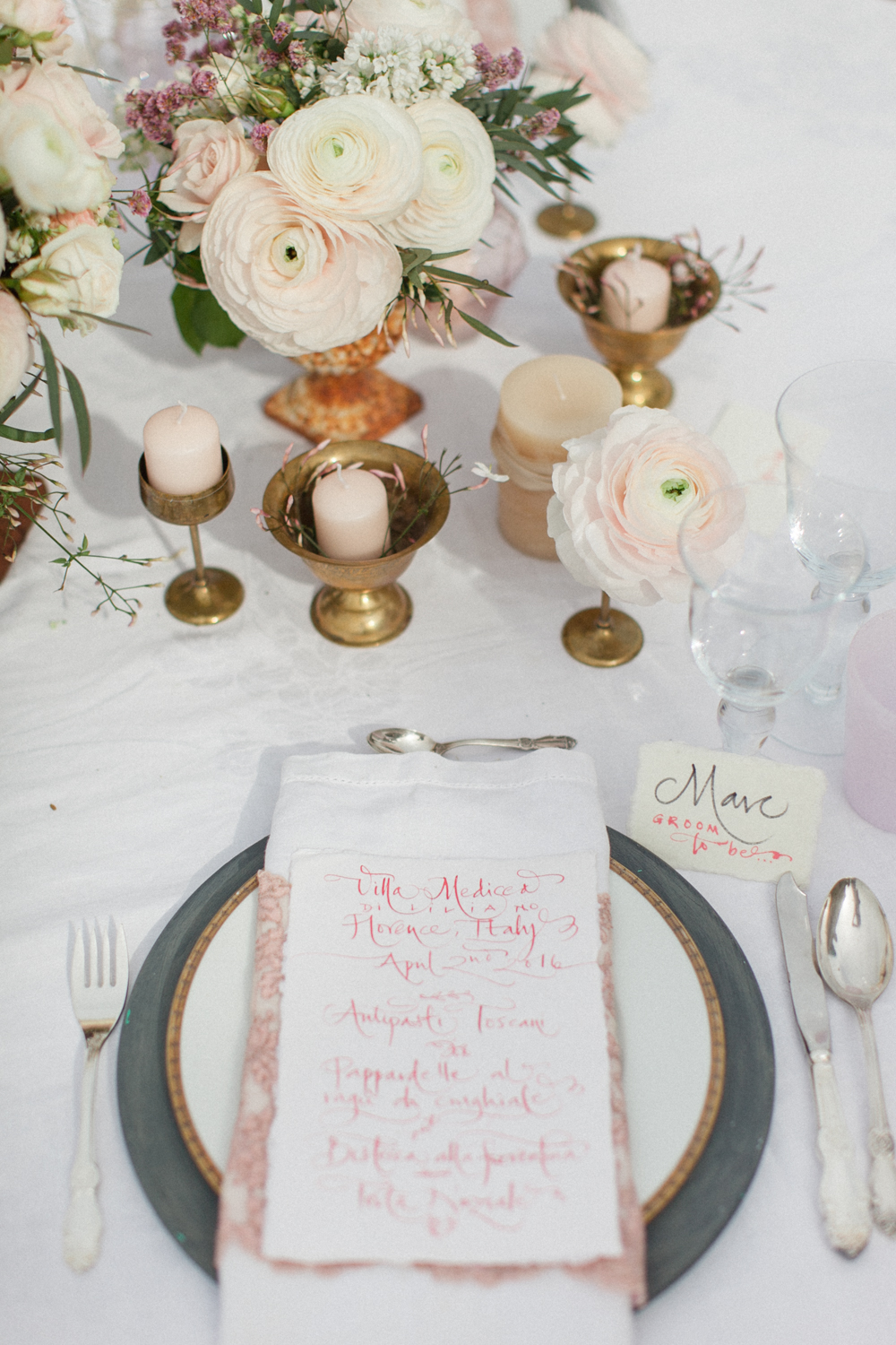The rose quartz colour palette styled by Natalia Music Weddings looked exquisite against the backdrop of the villa. I adored the dark grey charge plates that sat against the antique white flatware. The crystal glasses, silver cutlery and hand-dyed pastel pink lace created the most elegant and striking settings that really enhanced with occasion and brought a soft beauty to the table as did the breathtaking calligraphy by Betty Soldi – perfect for destination weddings in Italy.