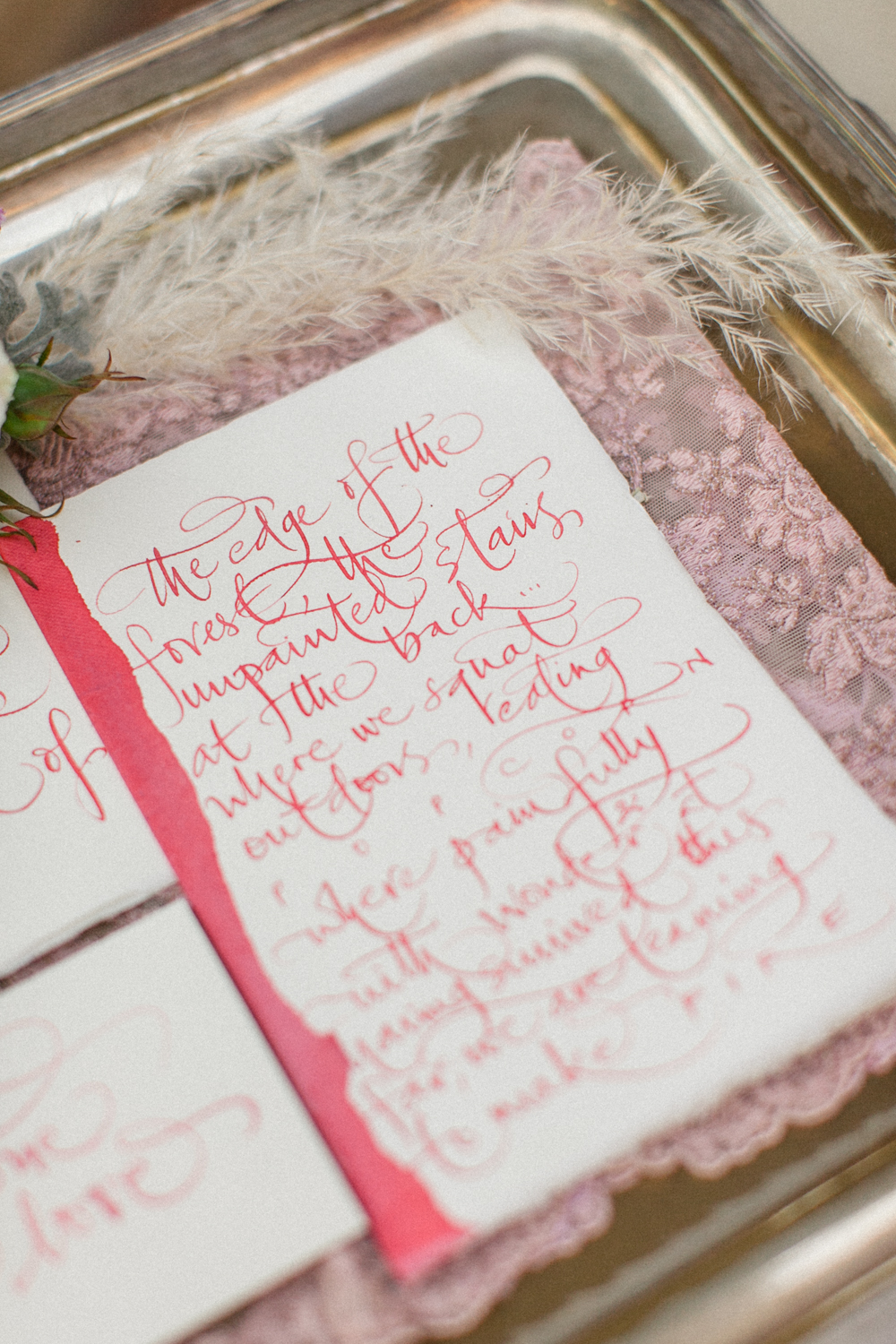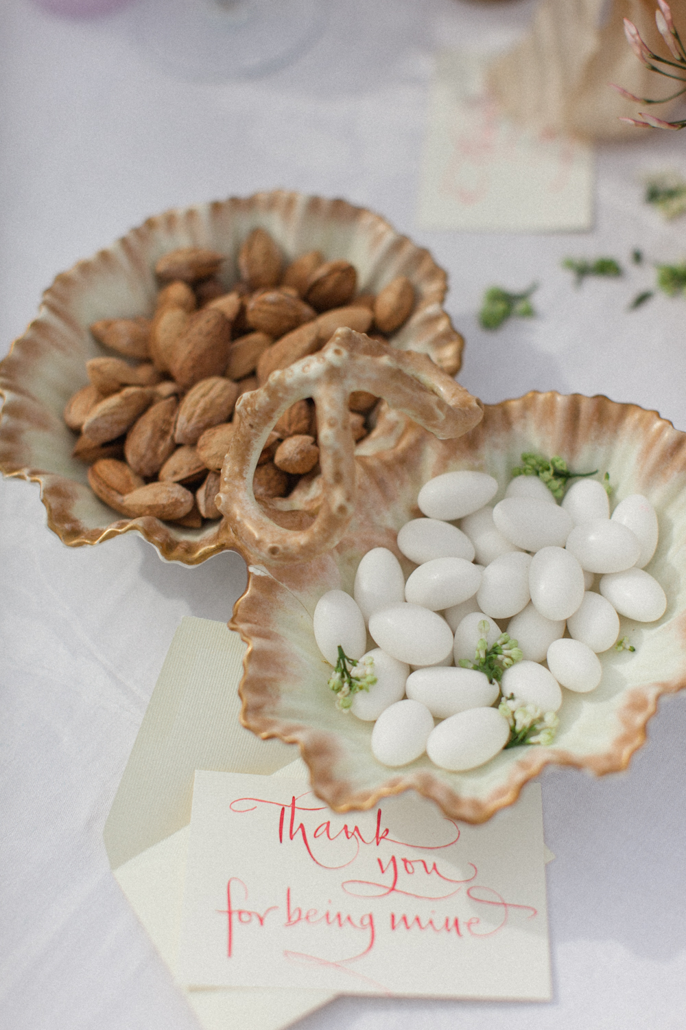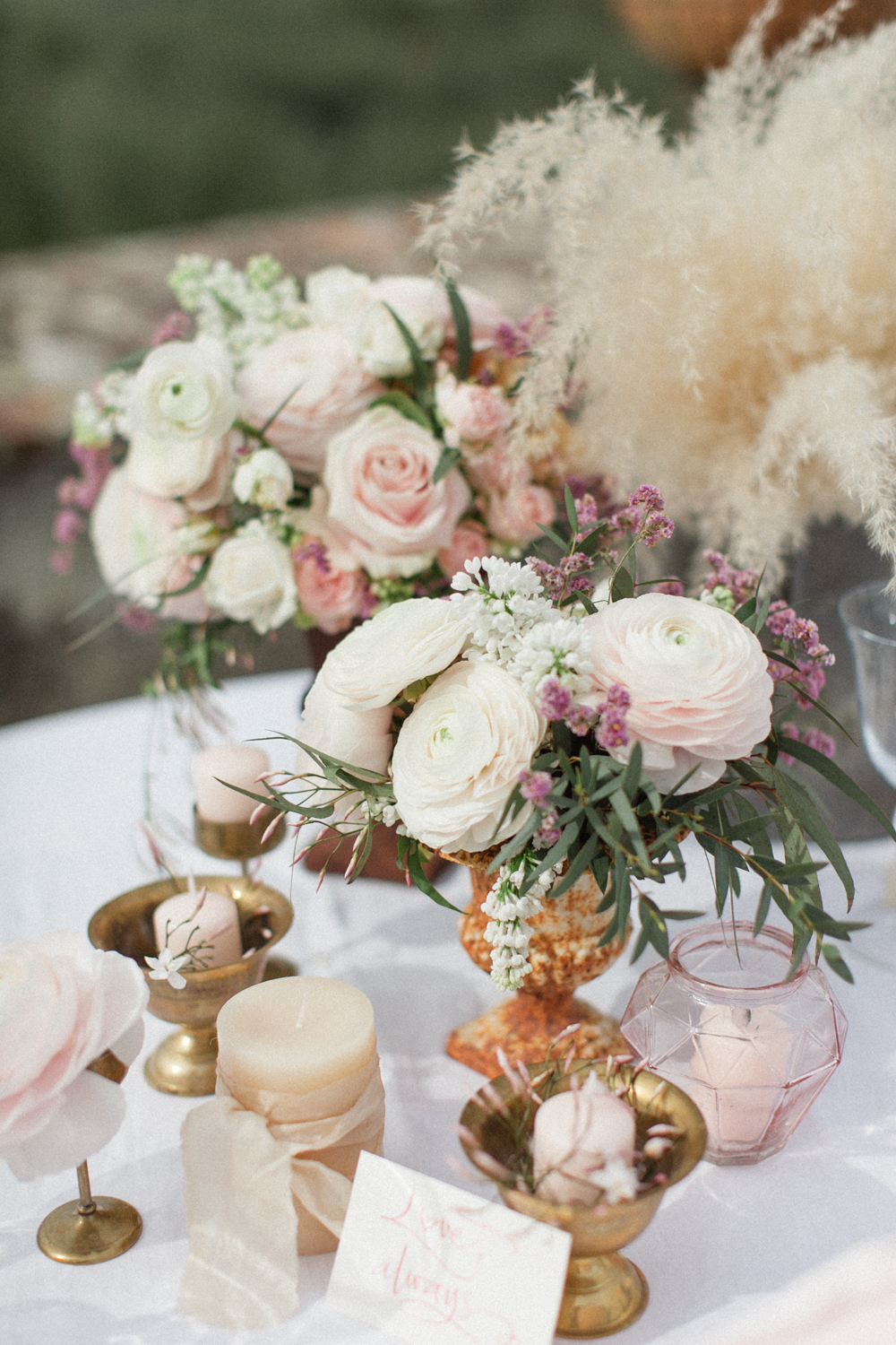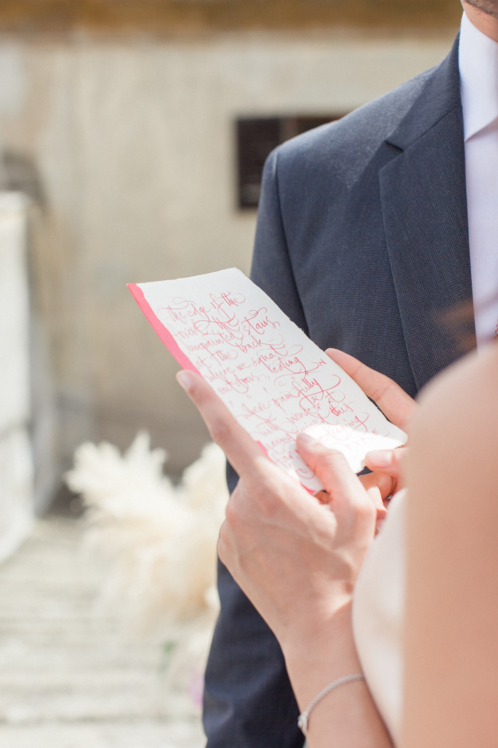 The rose quartz colour palette styled by Natalia Music Weddings looked exquisite against the backdrop of the villa. I adored the dark grey charge plates that sat against the antique white flatware. The crystal glasses, silver cutlery and hand-dyed pastel pink lace created the most elegant and striking settings that really enhanced with occasion and brought a soft beauty to the table as did the breathtaking calligraphy by Betty Soldi – perfect for destination weddings in Italy.