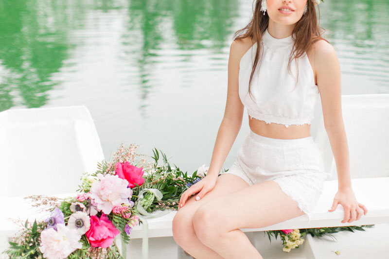After the softly romantic Marianna Lanzilli gown she wore in our previous features, our bride has radically altered her look and is now wearing a bridal crop top and lace hot pants, also by Marianna Lanzilli as she sets sail. This is a truly spectacular outfit that is, as Marianna says, for “that one in a million bride who dares to be different.”
