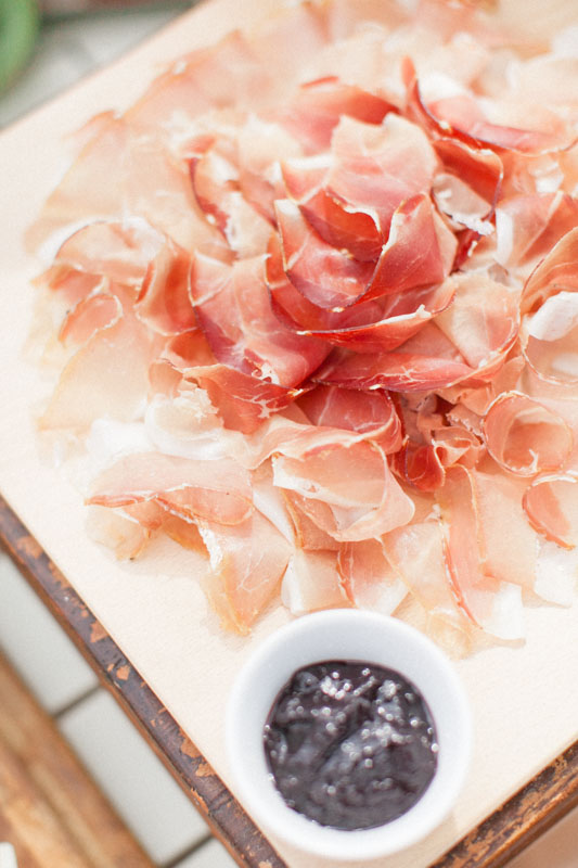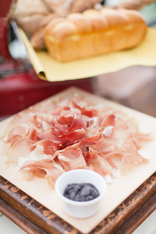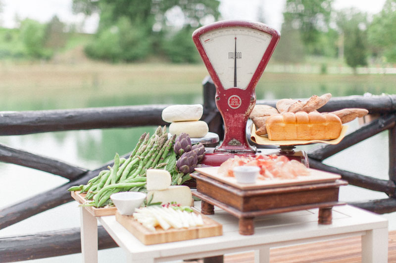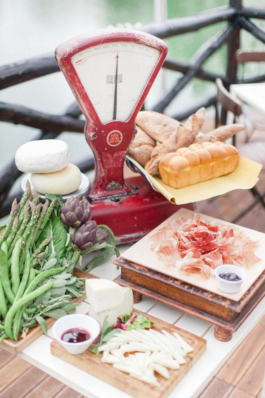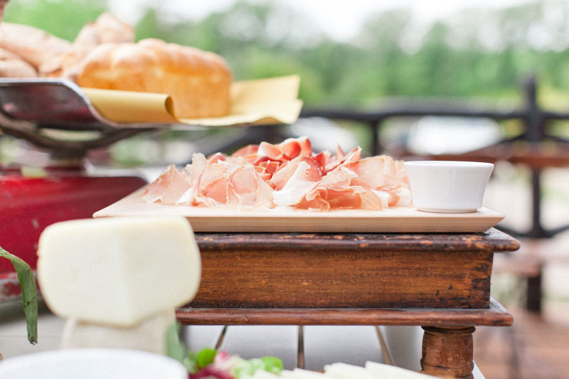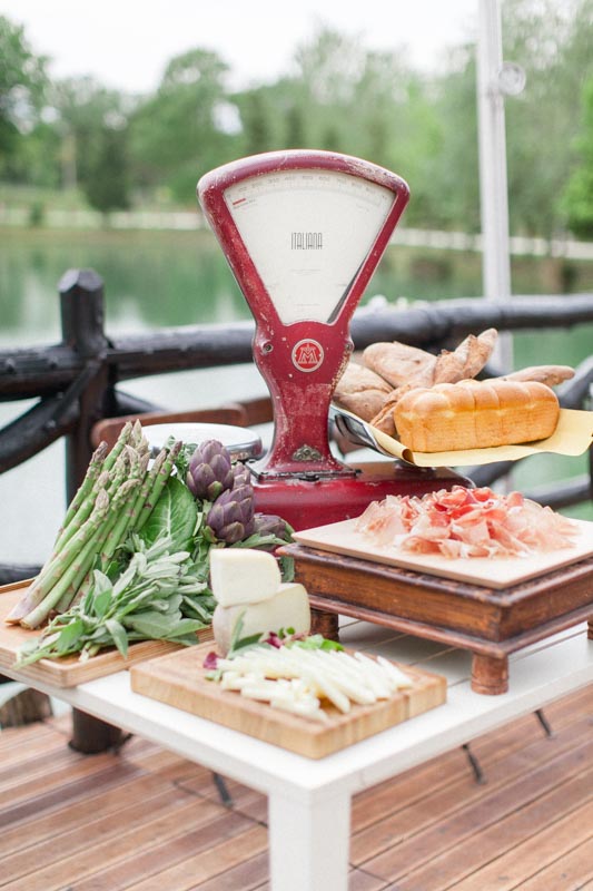 Outside on the verandah at Urbino dei Laghi, the superb restaurant at Urbino Resort, rustic platters full of delicious appetisers – vegetables from the farm, Italian cheeses and prosciutto, welcome our bride. Everything is locally produced and this gives a real sense of place to the event – when you’ve got such great ingredients on your doorstep, it’s definitely best to use them and regional delicacies are, in my view, essential for destination weddings.